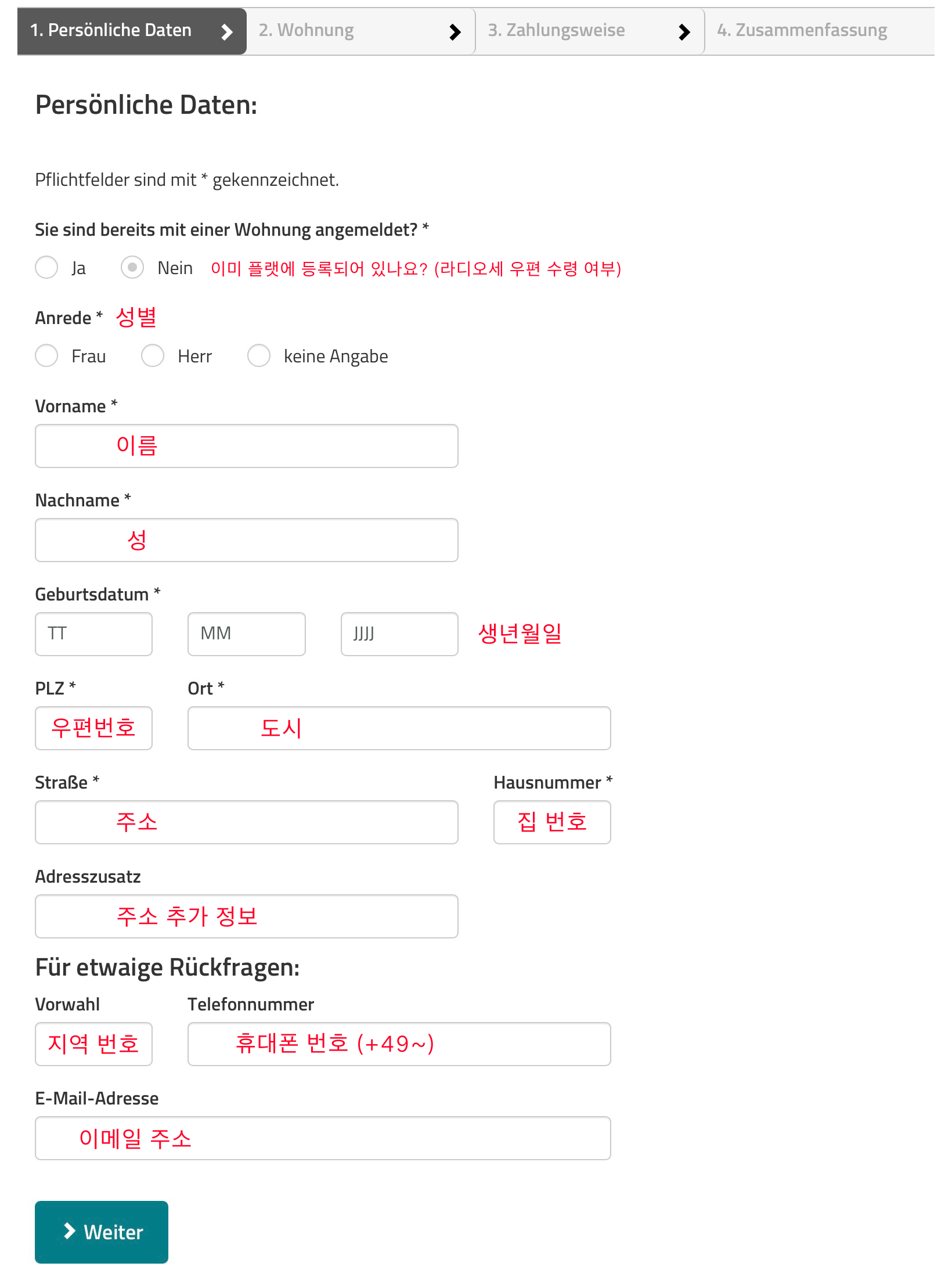 Personlich Daten에 적힌 본인 집 주소가 맞는지 확인 후 해당 가구로 등록을 하겠다는 ‘Obige Wohnung anmelden’을 선택해 주세요. 'Zumeldung einer weiteren Wohnung'은 위 주소 외에 거주지를 추가로 등록하겠다는 의미입니다.