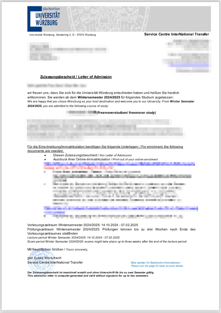 뷔르츠부르크 국제처에서 받은 입학 허가서 (Zulassung)을 그대로 출력해서 제출하면 됩니다.