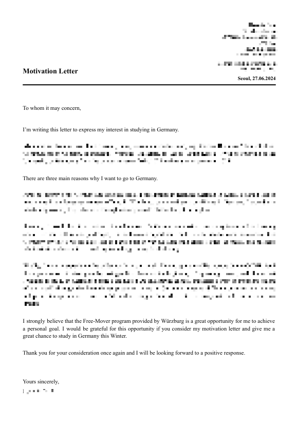 Motivation Letter은 자신이 독일에서 공부하려는 이유에 대해 간단히 한 페이지로 소개하는 글입니다.