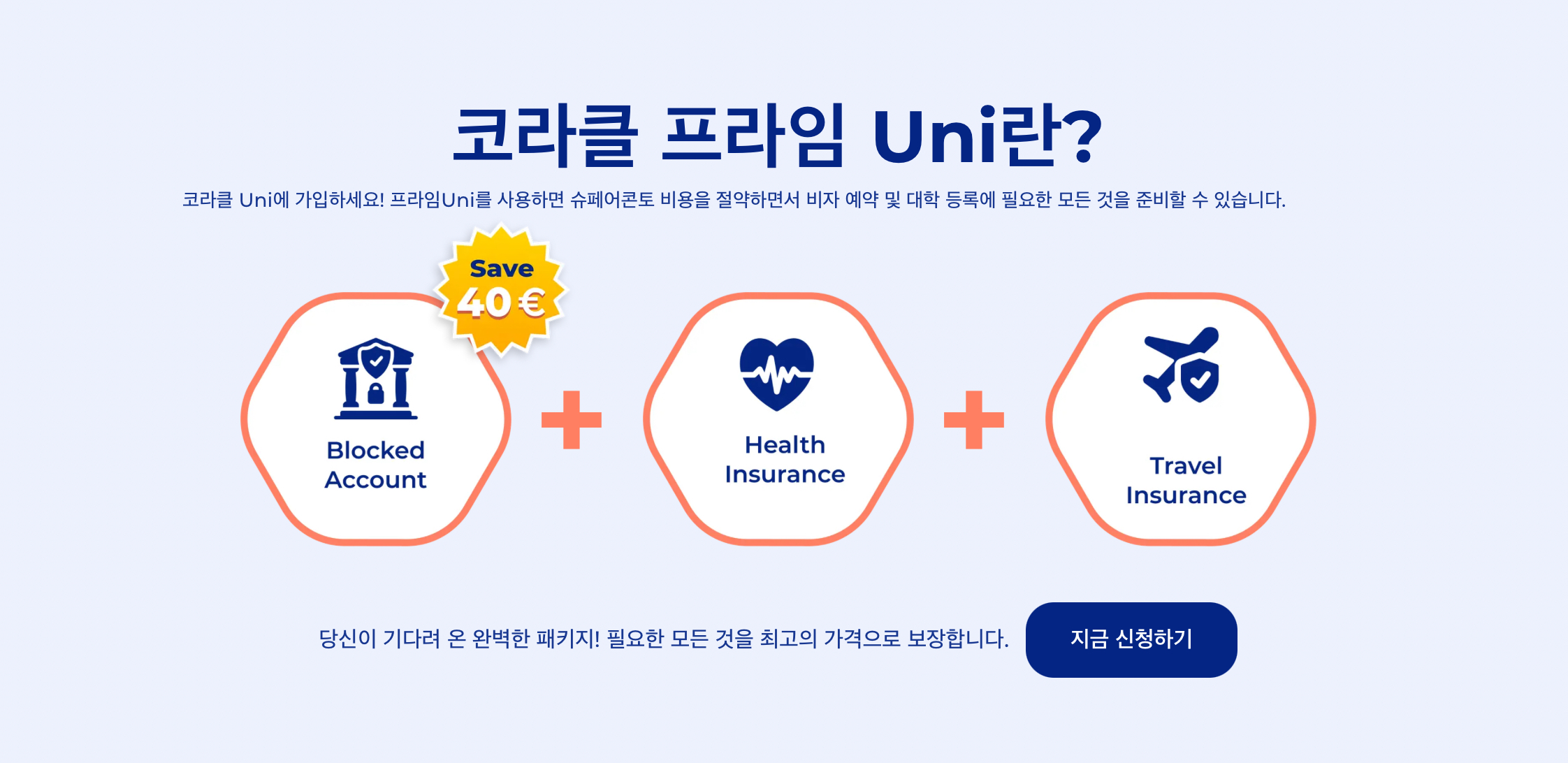 코라클은 유학생들의 편의를 위해 슈페어콘토, 독일 공보험, 공보험 활성화 이전 유효한 여행자보험까지 한 번에 프라임 Uni 패키지로 제공 하고 있습니다.