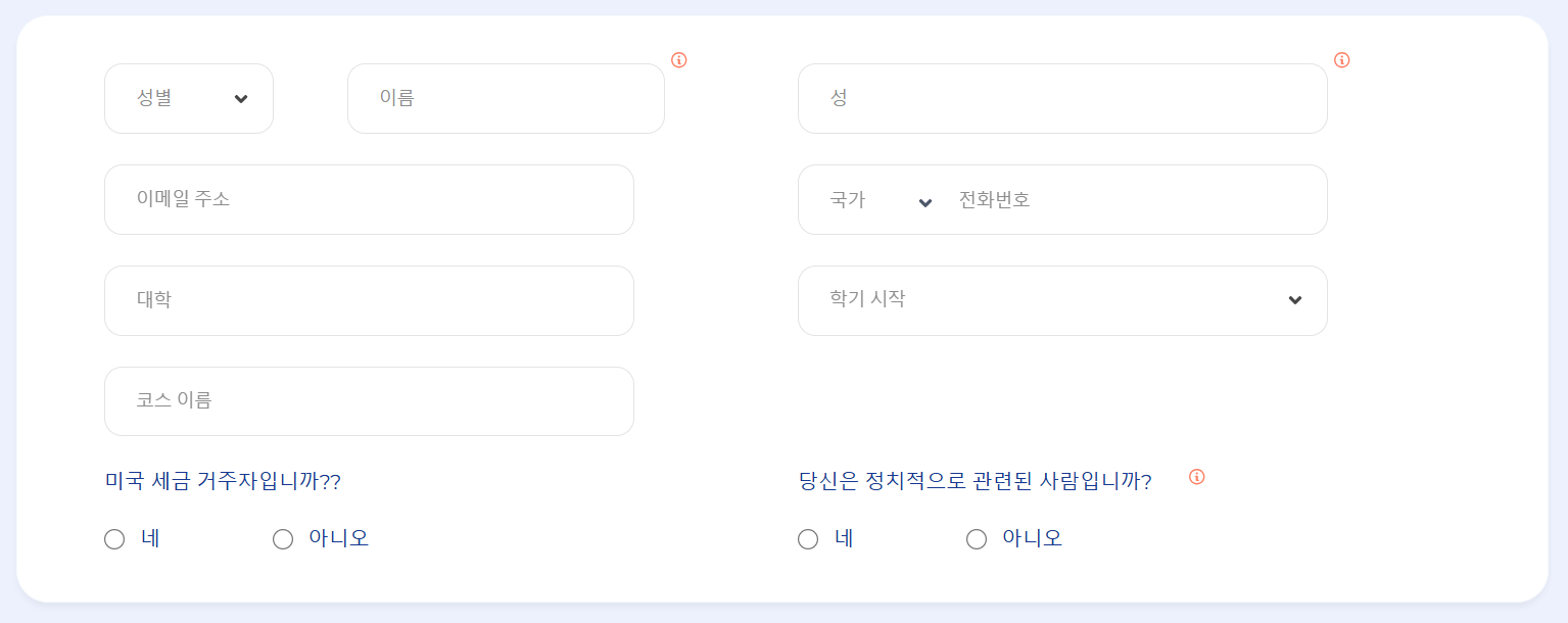한국어로 설정을 변경 후 개인정보를 채워주세요.
