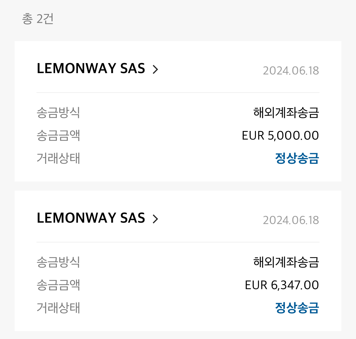 많은 분들이 해외 송금 모인을 이용하시는데요, 저는 24년도 6월 기준 송금 금액이 11,347유로여서 모인을 이용하면 3회 분할 송금을 해야만 했습니다. 그래서 카카오뱅크 송금으로 2회 분할 송금을 했으며, 2일 만에 최종 송금을 완료했습니다!