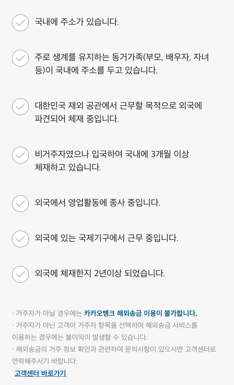 참고로 거주자가 아닐 시에는 카카오뱅크 해외송금 이용이 불가합니다.