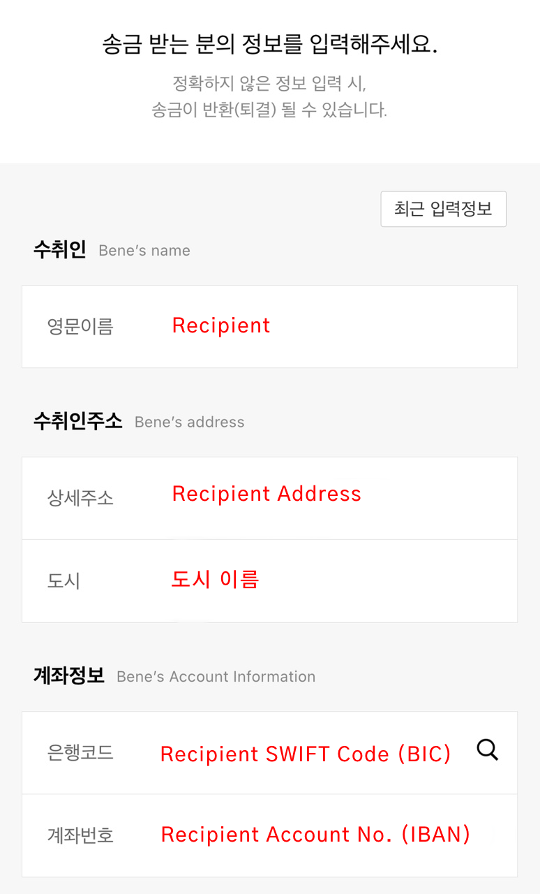 해외 송금은 수취인과 계좌번호가 가장 중요하므로 마지막까지 꼭 확인 후 보내주세요.